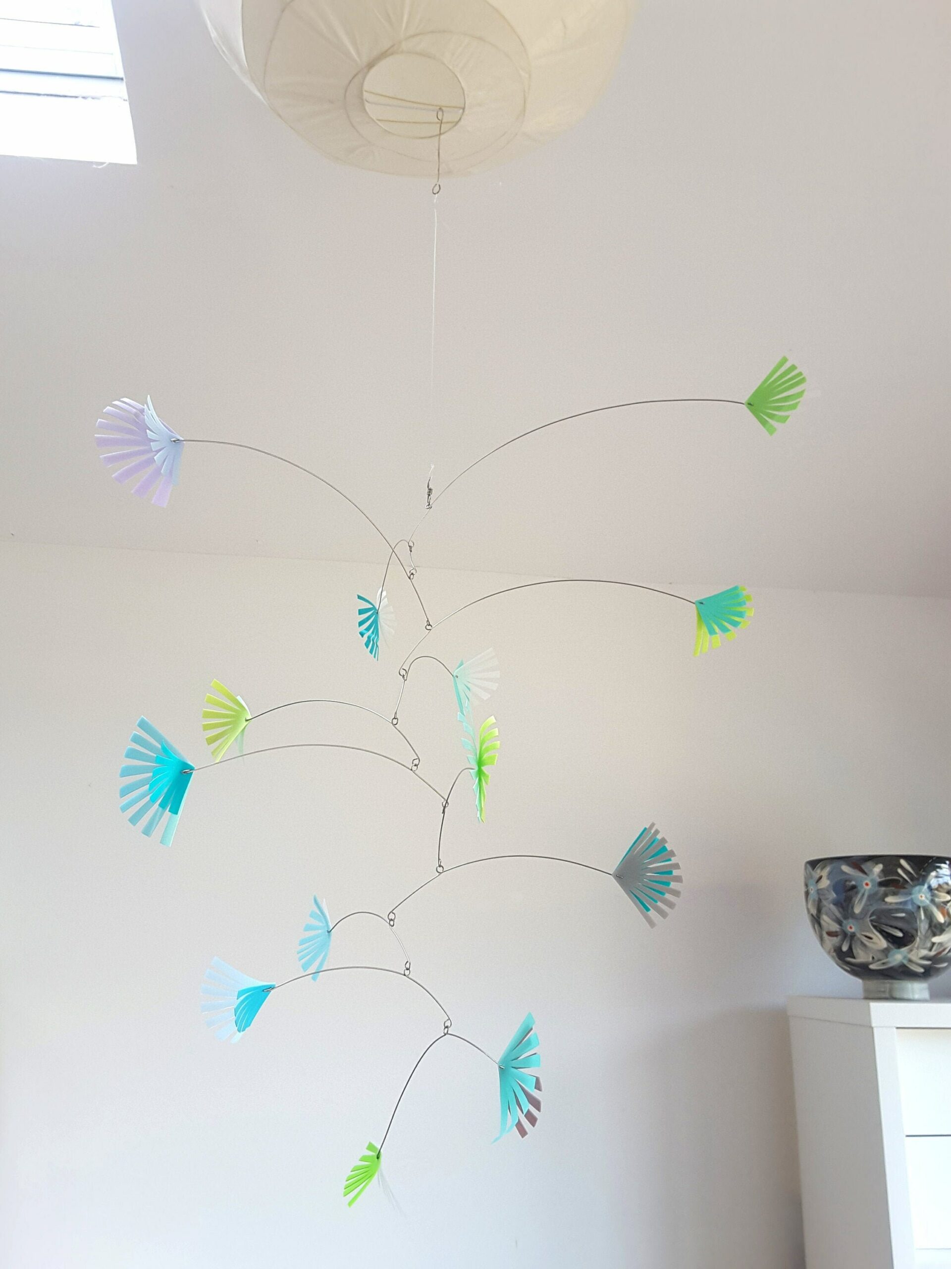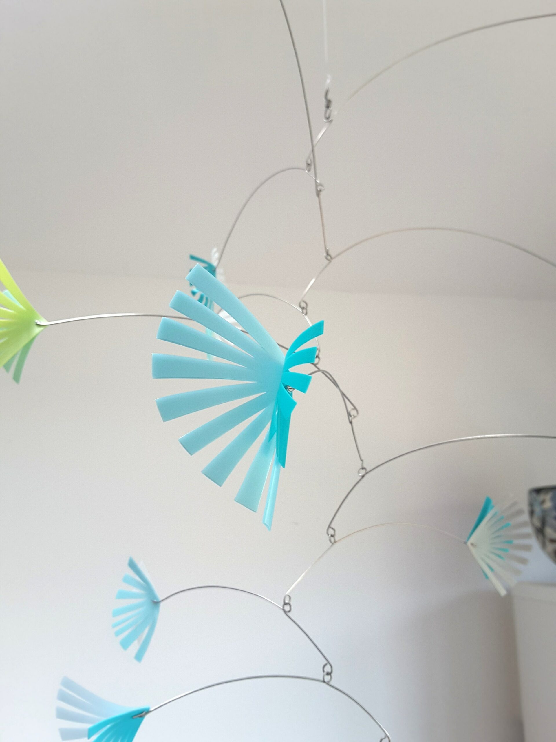 This turquoise and green coloured kinetic mobile is so uplifting, cheerful and calming.